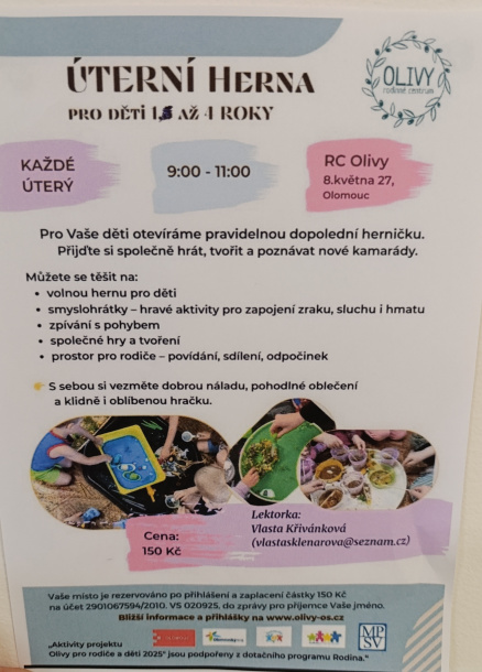 Hledáte klidné a dobře vybavené zázemí pro Vaši práci a současně i možnost pohlídání Vašeho dítka v oddělené místnosti, ale Vám nablízku? Nabízíme Vám vše v jednom příjemném balíčku. RC Olivy disponuje prostornou kanceláří s možností připojení k internetu, současně prostornou, bezpečnou a vybavenou hernou, kde si Vaše dítě může bezpečně hrát v péči našich hlídacích tet. Můžete využít kancelář i hlídání současně, ale nabízíme i jedno či druhé separátně, přesně dle Vašich potřeb.