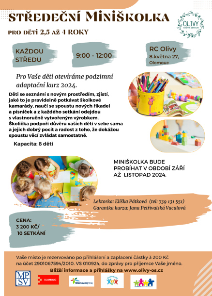Adaptační kroužek Miniškolka zve srdečně všechny děti, které se chystají na vstup do mateřské školky. V miniškolce získají děti v doprovodu maminek a tatínků jistotu a radost z pravidelné docházky za kamarády, množstvím zajímavých aktivit a příjemným prostředím naší velké herny. Naučíme se, že chodit do školky je prima a není se čeho bát a že všechno postupně zvládneme s paní učitelkou a moc se u toho budeme těšit na rodiče.