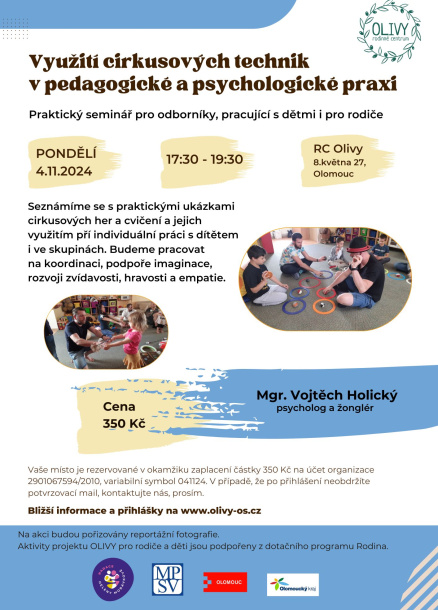 Seznámíme se s praktickými ukázkami cirkusových her a cvičení a jejich využitím pří individuální práci s dítětem i ve skupinách. Budeme pracovat na koordinaci, podpoře imaginace, rozvoji zvídavosti, hravosti a empatie.