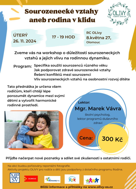 Zveme vás na workshop o důležitosti sourozeneckých vztahů a jejich vlivu na rodinnou dynamiku.