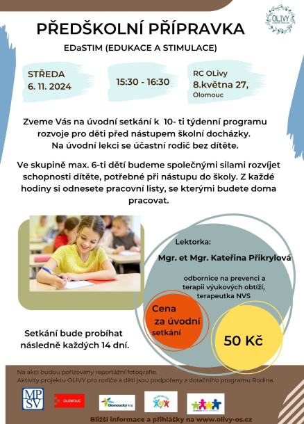 Ve skupině max. 6-ti dětí budeme společnými silami rozvíjet schopnosti dítěte, potřebné při nástupu do školy. Z každé hodiny si odnesete pracovní listy, se kterými budete doma pracovat.