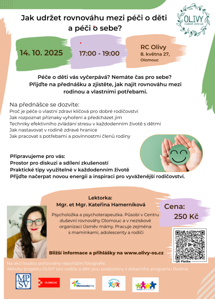 Lektorka: Mgr. et Mgr. Kateřina Hamerníková, psycholožka a psychoterapeutka. Působí v Centru duševní rovnováhy Olomouc a v neziskové organizaci Úsměv mámy. Pracuje zejména s maminkami, adolescenty a rodiči.